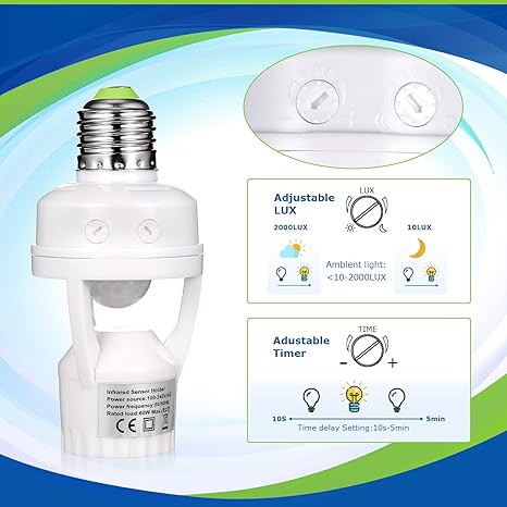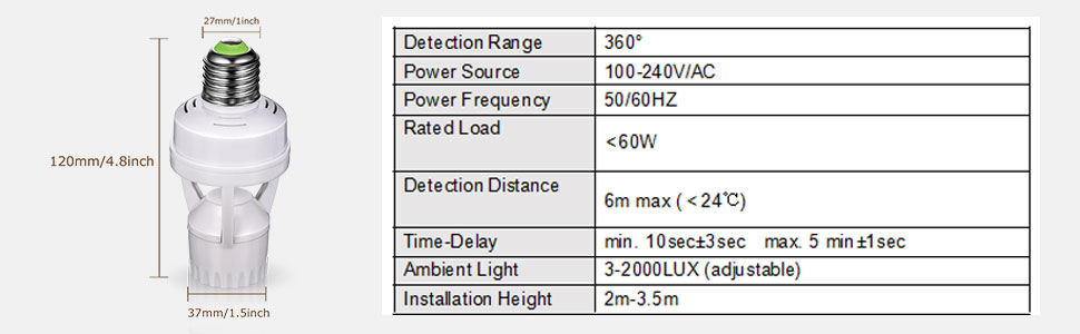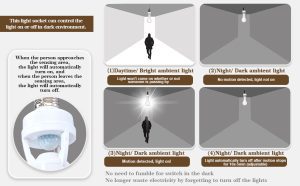 - Adjustable Illumination Duration: this motion activated light socket can set the illumination time (10 seconds -5 minutes) and illumination (3-2000 lux), and you can adjust the illumination according to your own preferences and needs, to achieve the desired effect and bring convenience to your life