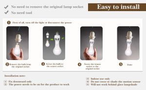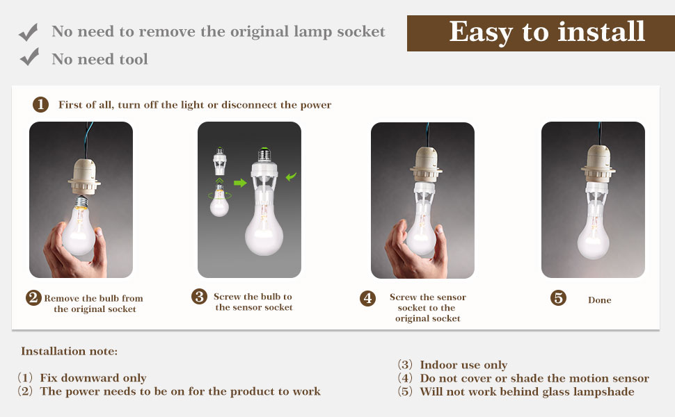 - Simple Installation: you only need to screw our motion light socket adapter into the existing bulb socket, and then screw the bulb into the other end of our lamp holder to complete the installation without too many tools and extra wires, convenient for you to install and replace